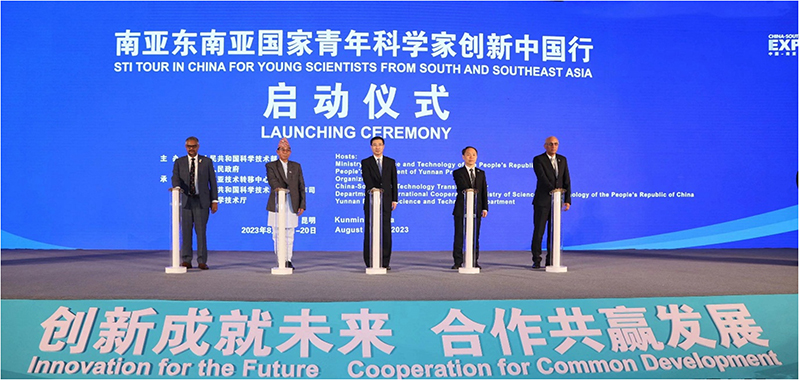 中国科学技术部副部长张广军、尼泊尔教育与科技部部长阿肖克•库马尔•拉伊、斯里兰卡技术部国务部长卡纳卡•达萨拉塔•赫拉特、巴基斯坦驻华大使莫因•哈克共同参加“南亚东南亚国家青年科学家创新中国行”启动仪式。