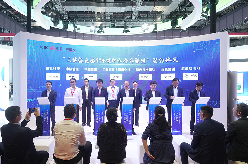 作为支撑可持续发展与“双碳”目标的科技成果转化平台,“中心”此次筛选18项具有转化价值的绿色技术,涉及水处理、固废资源化、土壤修复、先进材料等领域,与工商银行携手在“碳博会”上进行推广。工商银行作为绿色技术银行领导小组成员单位,以绿色金融助力技术创新与应用,为绿色技术成果转化提供绿色信贷支持。谢文澜副主任指出,构建绿色技术的创新新格局,需要多方携手并进,“工银绿色银行+碳中和合作联盟”的成立将对推动清洁能源、绿色交通运输等产业加速高质量发展、经济转型升级起到积极的作用。“联盟”同时邀请申能集团、中核集团、捷氢科技、远景能源等企业共同参与。签约仪式上,绿技行(上海)科技发展有限公司与工商银行上海分行签署协议,获得400亿专项授信额度,用于支持绿色技术转移转化。
